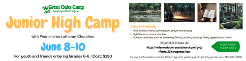 Held annually at Great Oaks Camp in Lacon, Illinois, the camp invites youth going into 6th-8th grades in the fall (after camp) to participate, and friends are always invited! This camp is a Peoria-area partnership with Redeemer, Christ & Mt. Calvary Lutheran Churches. Senior high youth (going into 9-12th grades) from these churches in partnership with the camp’s staff are invited to serve as youth leaders. A variety of activities take place including Bible study and worship, group building initiatives, high ropes experiences, hiking and fishing, play and just an all-around great time with friends.